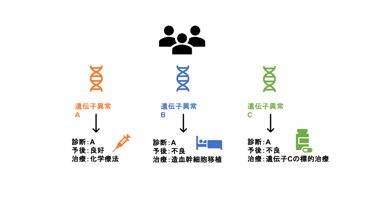 この検査の目的は、患者さんの造血器腫瘍や類縁疾患の特徴をゲノム解析によって網羅的に調べ、より正確な診断、適切な薬剤/治療法の選択、治療効果の予測を行うことにより、造血幹細胞移植の適応決定や臨床試験への参加の検討など、患者さんの治療方針決定に役立てることになります。